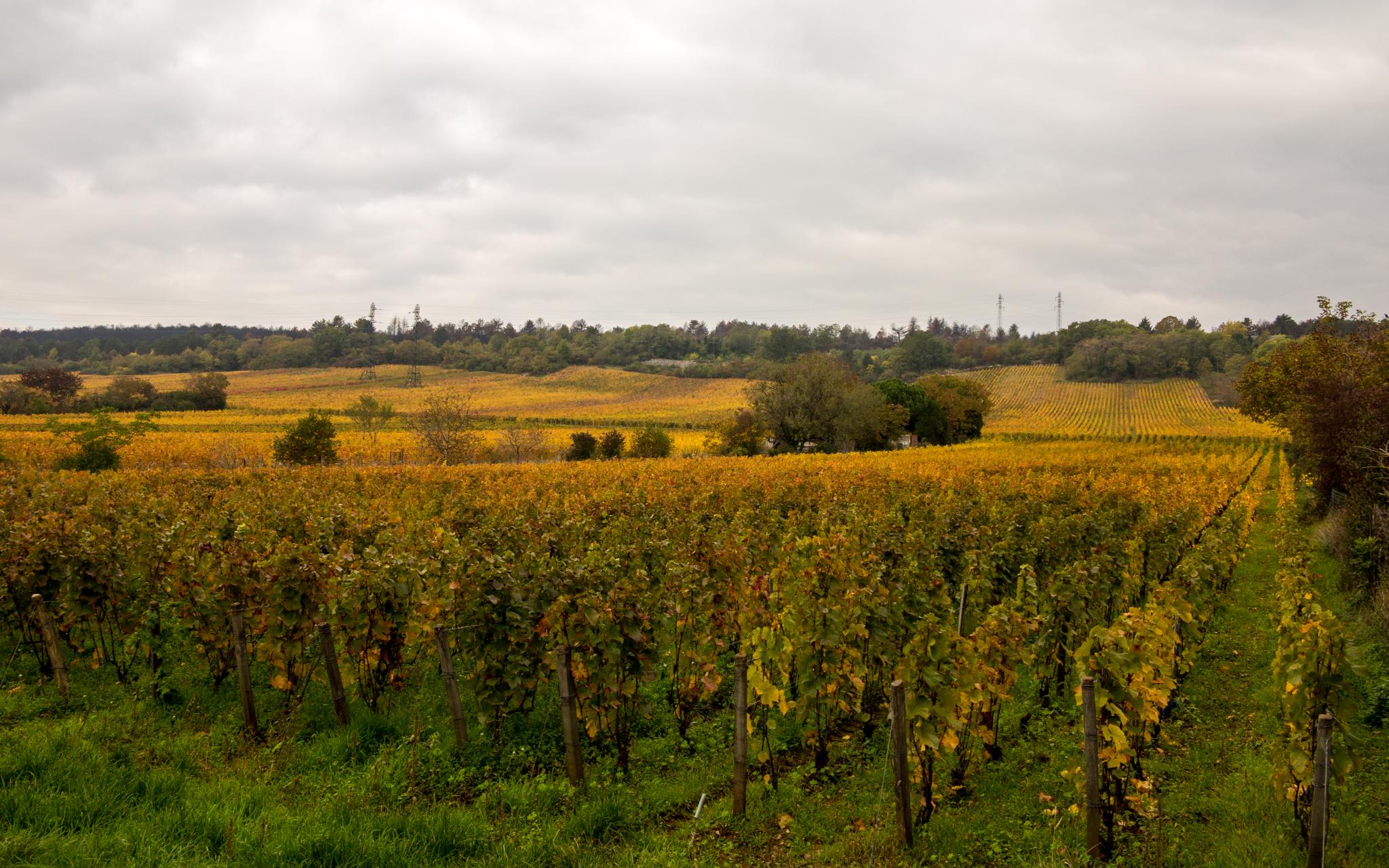 Kurz drauf erreiche ich die ersten Weinberge. Die Stadt hört abrupt auf und es geht ins Weinland. Die Sonne lacht mir, und so komme ich frohen Mutes gut voran; das Bein macht keinen Ärger.